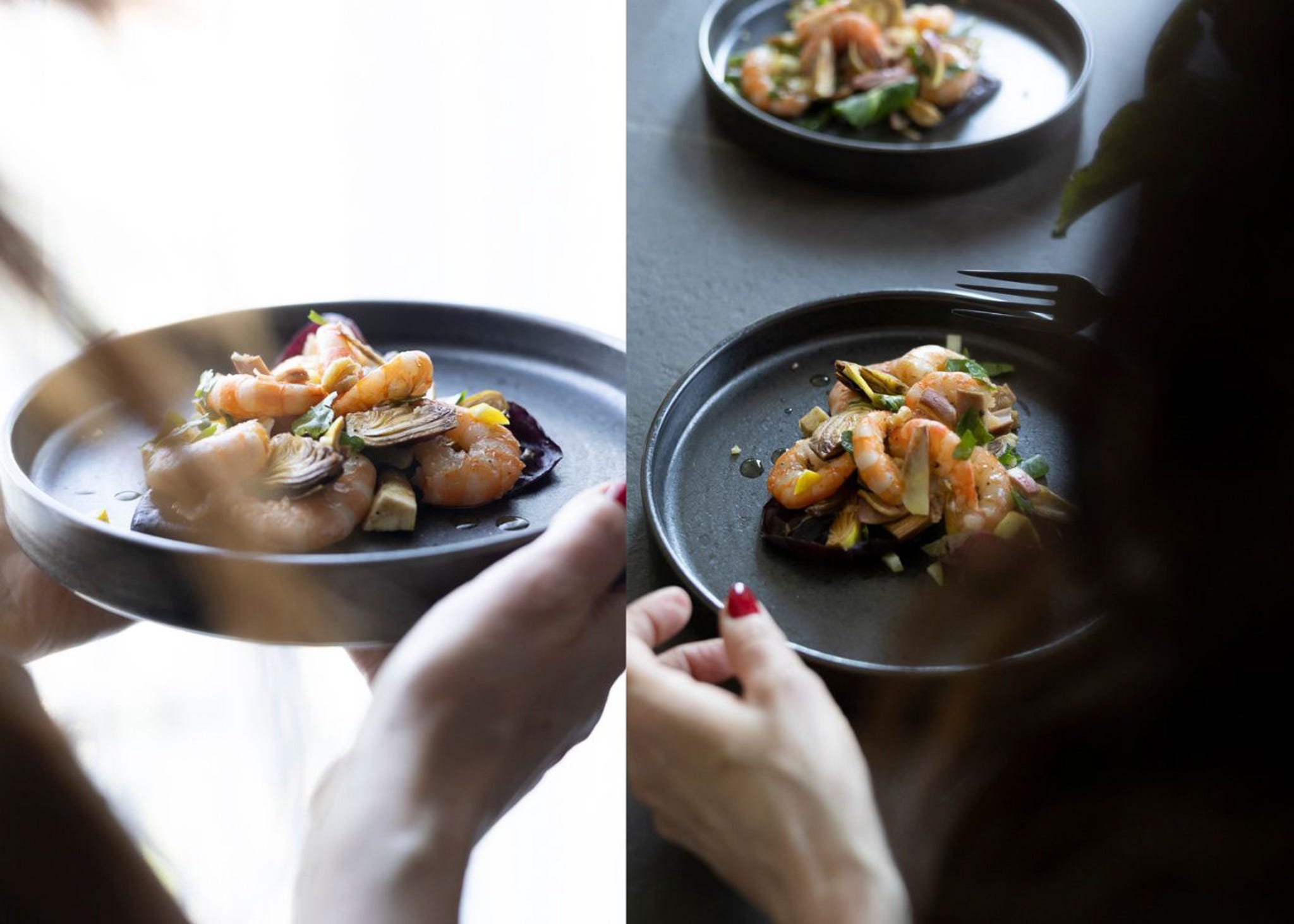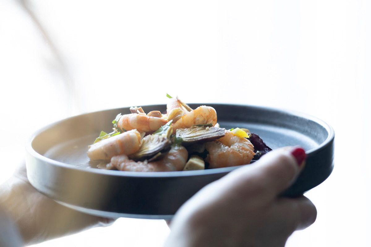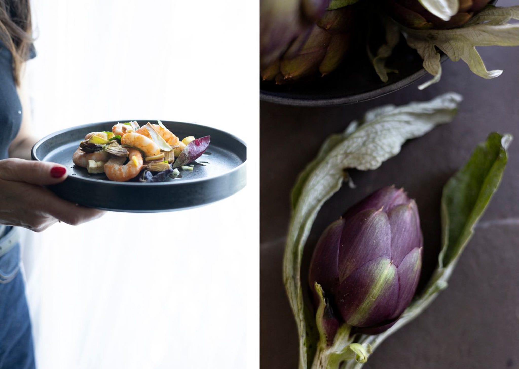 Mazzancolle are caught off the Venetian coast precisely in this period, between March and April. Their flesh is sweet, full, almost velvety. A marine sweetness that meets the green, herbaceous notes of the artichoke, creating a subtle balance.