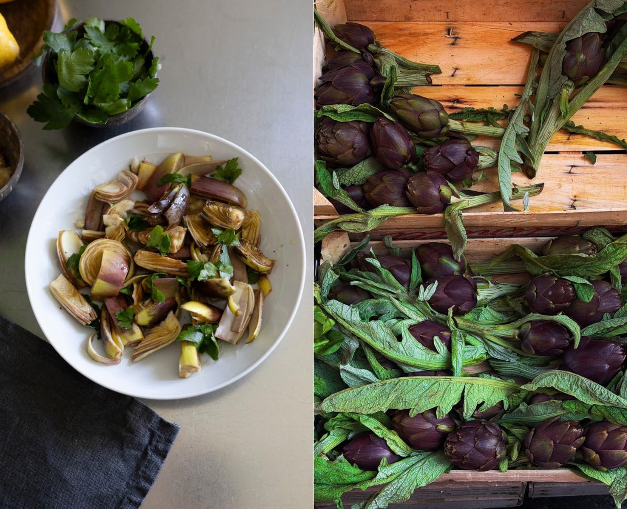 The way I love them most is raw: thinly sliced, dressed with extra virgin olive oil and a few drops of lemon. A simple preparation that allows their herbaceous, luminous character to remain intact.